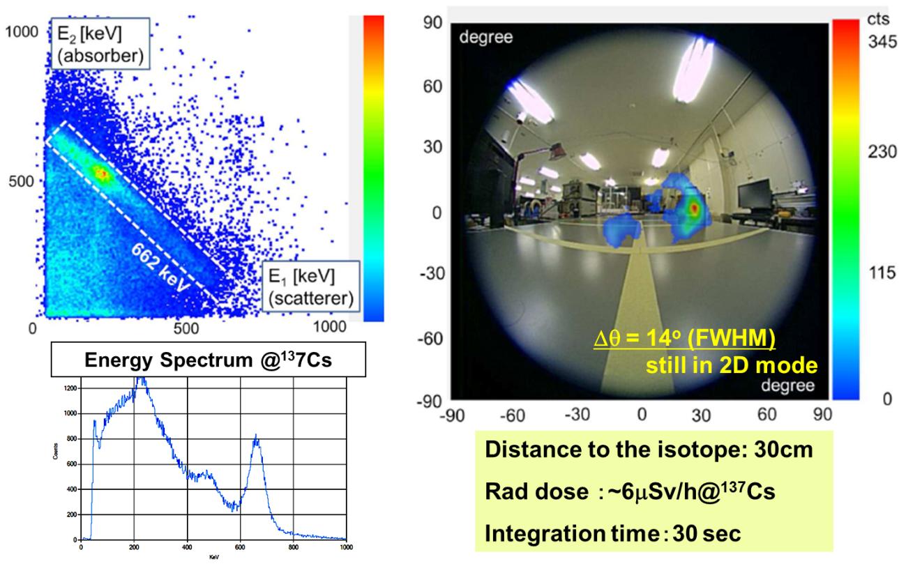 このような背景から、片岡研究室では JST先端計測技術プログラムのご支援のもと、浜松ホトニクス社と共同で革新的ガンマ線可視化装置の開発を行っています。2013年度末までに、従来技術では実現困難であった、小型軽量で携行(携帯)性に優れ、かつ十分な高感度と角度分解能を有するガンマ線可視化装置(ポータブル型コンプトンカメラ)を開発します。我々の採用する方式はコンプトンカメラですが、散乱体・吸収体ともに(半導体検出器でなく)無機シンチレータ(たとえばCe:GAGG結晶)を採用します。一般に、シンチレータは容易に厚みを稼ぐことが可能で、ガンマ線に対する感度を高めることができます。一方で、ガンマ線の反応位置が不定のため、良好な解像度を得ることが困難な問題がありました。我々は、独自の方式を用いてガンマ線の反応位置情報を3次元的に、1mmの精度で解像する手法を確立し、これをコンプトンカメラに応用することに成功しました。すなわち、シンチレータの感度を損なうことなく、解像度を10deg(FWHM)以下にまで向上することができます。